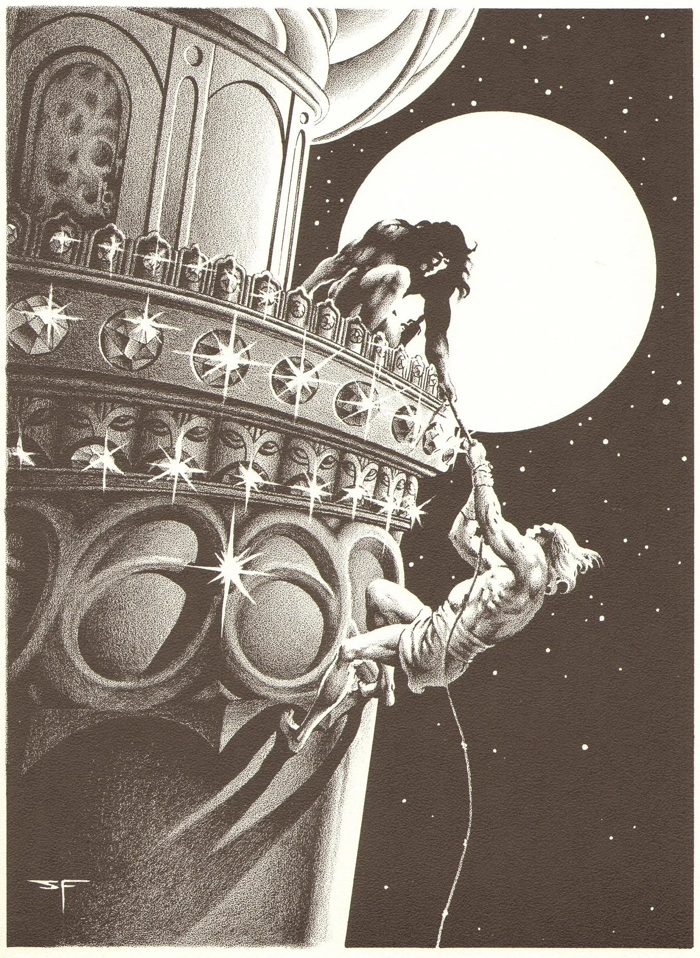 Немедієць узявся за мотузок, пропустив його під коліно й почав підійматись. Попри зайву вагу, він підіймався легко, наче кіт. (Вежа Слона)